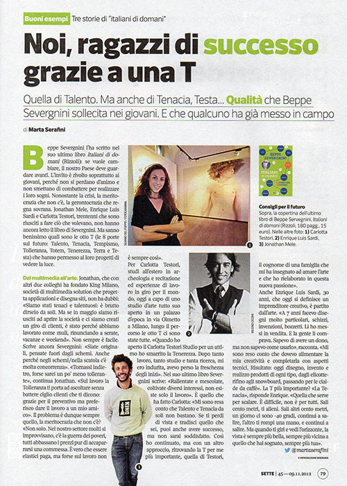 […] Anche Enrique Luis Sardi, 30 anni, che oggi si definisce un imprenditore creativo, è partito dall’arte. “A 7 anni facevo disegni molto particolari, schizzi, invenzioni, bozzetti. Li ho messi in vendita. E la gente li comprava. Sapevo di avere un dono, ma non sapevo come usarlo”, racconta. “Mi sono reso conto che dovevo alimentare la mia creatività e completarla con aspetti tecnici. Risultato: oggi disegno, invento e realizzo prodotti di ogni tipo, dagli elicotteri fino agli snowboard, passando per le cialde da caffè”. La T più importante? “La Tenacia”, risponde Enrique. “Quella che serve per scalare. E’ difficile, non è per tutti. Sali cento metri, un” giorno ci sono -40 gradi, continui a salire, l’altro ti rompi una mano, e continui a salire. Ma quando ti giri e vedi l’orizzonte, la vista è sempre più bella, sempre più vicina a quello che hai sognato, sempre più tua”.