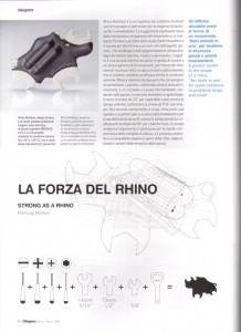 Rhino multitool è il corrispettivo del coltellino multiuso svizzero pensato in particolare per le esigenze di skater, surfer e snowboarder. La suggestione espressiva nasce dalla resistenza e compattezza del rinoceronte, a cui il designer Enrique Luis Sardi dello studio Sardi-innovation si è ispirato per dare forma a un multitool dall’aspetto “giocoso”, che nel design e nell’ingegnerizzazione utilizza strategie del settore sportivo, medico e aeronautico. L’oggetto è una piccola officina tascabile, in grado di ovviare a un’ampia gamma di inconvenienti, per mezzo dei dieci utensili racchiusi nella struttura in inox e policarbonato, che o rendono versatile ed efficace anche in condizioni estreme. Rhino è costituito da due parti che compongono un portachiave. La prima, conformata come la testa del rinoceronte, è un cacciavite a quattro punte intercambiabili, contenute nella pancia. Le orecchie diventano un apribottiglie, il corno, la chiave da 1/2″ per i dadi delle ruote, mentre le zampe anteriori conformano la chiave da 9/16″ per kingpin. Nel secondo componente, il corpo, trova posto una spatola e un pettine (per la sciolina dello snowboard e per il wax della tavola da surf), mentre le zampe posteriori costituiscono la chiave da 3/8″ per i dadi dei truck. Il concept evidenzia l’ergonomia e l’attenzione per la rapida comprensione delle modalità di utilizzo, e il processo produttivo eco compatibile rispetta lo spirito della “tribù” degli utilizzatori, amanti delle emozioni della natura.