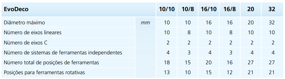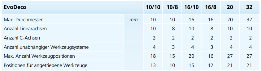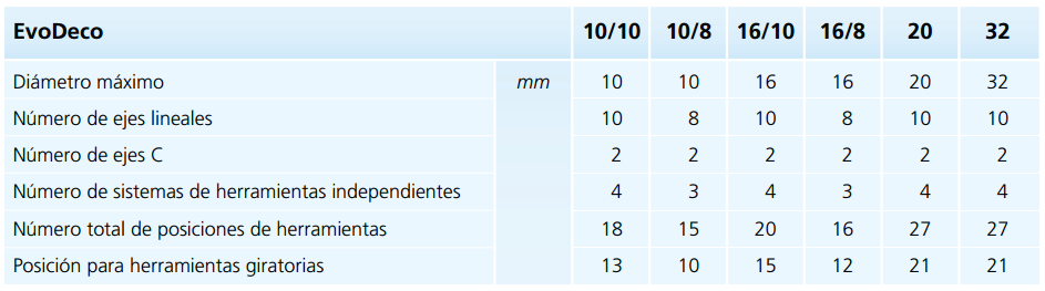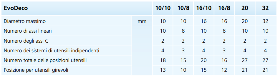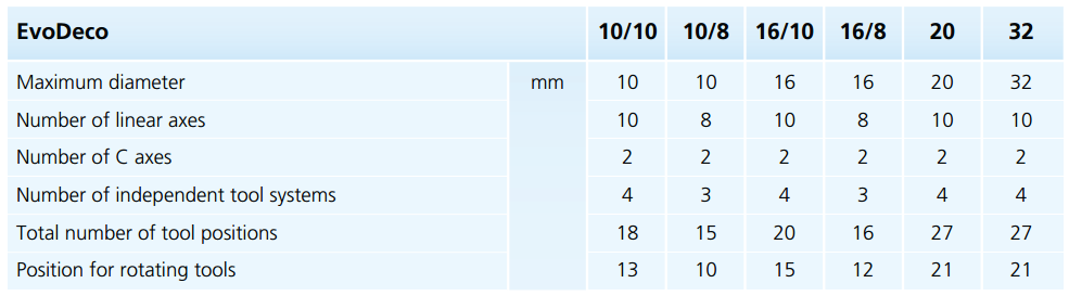 A partir de agora, a nova linha lançada em 2013 após a apresentação da máquina EvoDeco 32 está completa. Essa série de máquinas constitui o topo da pirâmide dos tornos automáticos disponíveis, única e incomparável, essas novas máquinas são baseadas no conceito da Deco que, com mais de 7000 unidades vendidas, é a máquina de alta performance mais vendida no mundo.