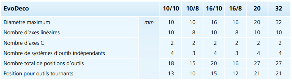 La flamante gama iniciada en 2013 tras la presentación de la máquina EvoDeco 32 ya está completa. Esta serie de máquinas constituye el vértice de la pirámide de los tornos automáticos disponibles. Estas nuevas máquinas, únicas y sin competencia, se basan en el concepto Deco que, con más de 7000 unidades vendidas, es sin duda la máquina de gama alta más extendida en el mundo.