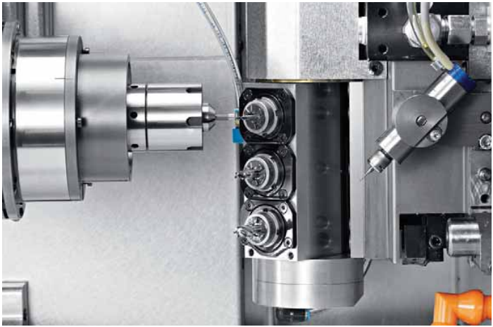 Placé en contre-opération, l’axe B de la machine EvoDeco 16 permet à l’utilisateur de programmer n’importe quel angle sans aucun réglage mécanique, le gain de temps est simplement fulgurant. Certains fabricants d’implants dentaires pour lesquels une pièce se prête bien à la machine EvoDeco 16 et à son axe B, ont vu leur productivité croîte de plus de 50 % grâce à ce seul axe numérique. L’axe B comporte 3 positions entraînées et une 4e position fixe.