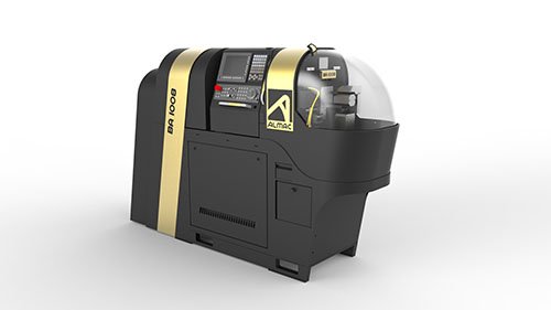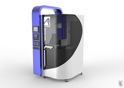 De plus le logo Almac redessiné pour l’occasion a été partiellement intégré dans le VA 1008, en tout cas le “A”, utilisé comme un ruban bleu entourant verticalement la machine. Cette même idée de ruban est intégré dans la BA 1008 et coloré en «or» pour bien marquer que cette fraiseuse en barre est véritablement conçue pour les horlogers. De plus le designer Enrique Luis Sardi a voulu apporter une touche personnelle à ces machines… Ainsi dans le centre d’usinage de précision VA 1008 il a apposé sur le devant de la machine une sorte de gros bouton d’or que chaque client-utilisateur peux configuer à sa guise, par exemple «Fabriqué pour Ulysse Nardin par Almac», le tout accompagné d’un fanion suisse.